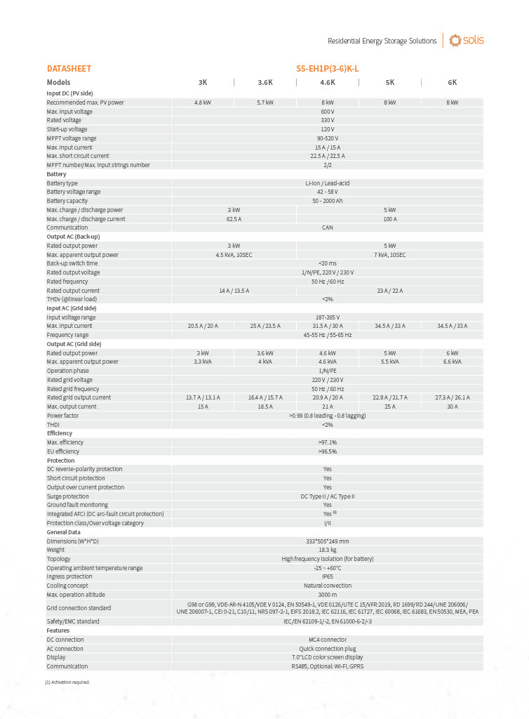 - Battery Voltage Range: 42-58 V | Max. Charge/Discharge Power: 5 kW